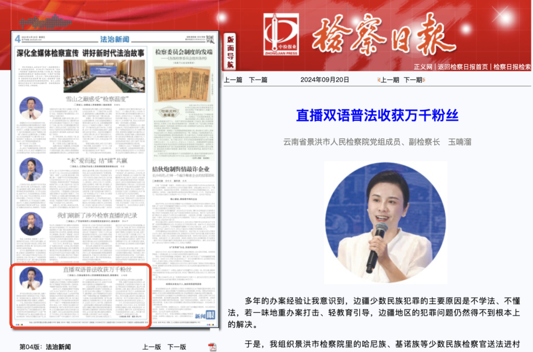 我想,直播不仅能普及法律知识,讲好检察故事,它还拥有强大的感召力,通过少数民族语言的娓娓道来、通过节日盛装的精心点缀、通过与群众的家长里短,让法治春风吹进千家万户。如果检察办案是护航经济社会高质量发展的主线任务,那么,我们的直播,就是参与到边疆社会治理中的一条不可忽视的支线任务,而这条支线任务,就叫作春风化雨、法润人心。