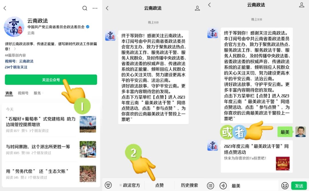 1.微信参与:微信搜索云南政法(ynzfyn)微信公众号,或点击后识别下方二维码关注本公众号,点击下方菜单栏【点赞】或在对话框回复“最美”,即可进入小程序参与活动。