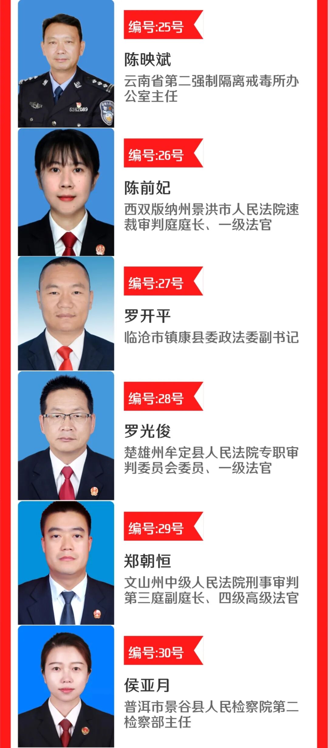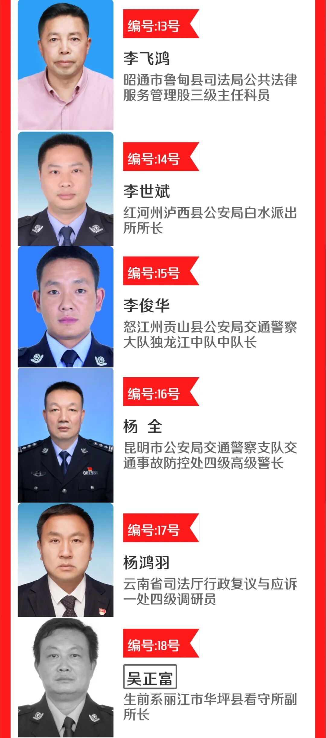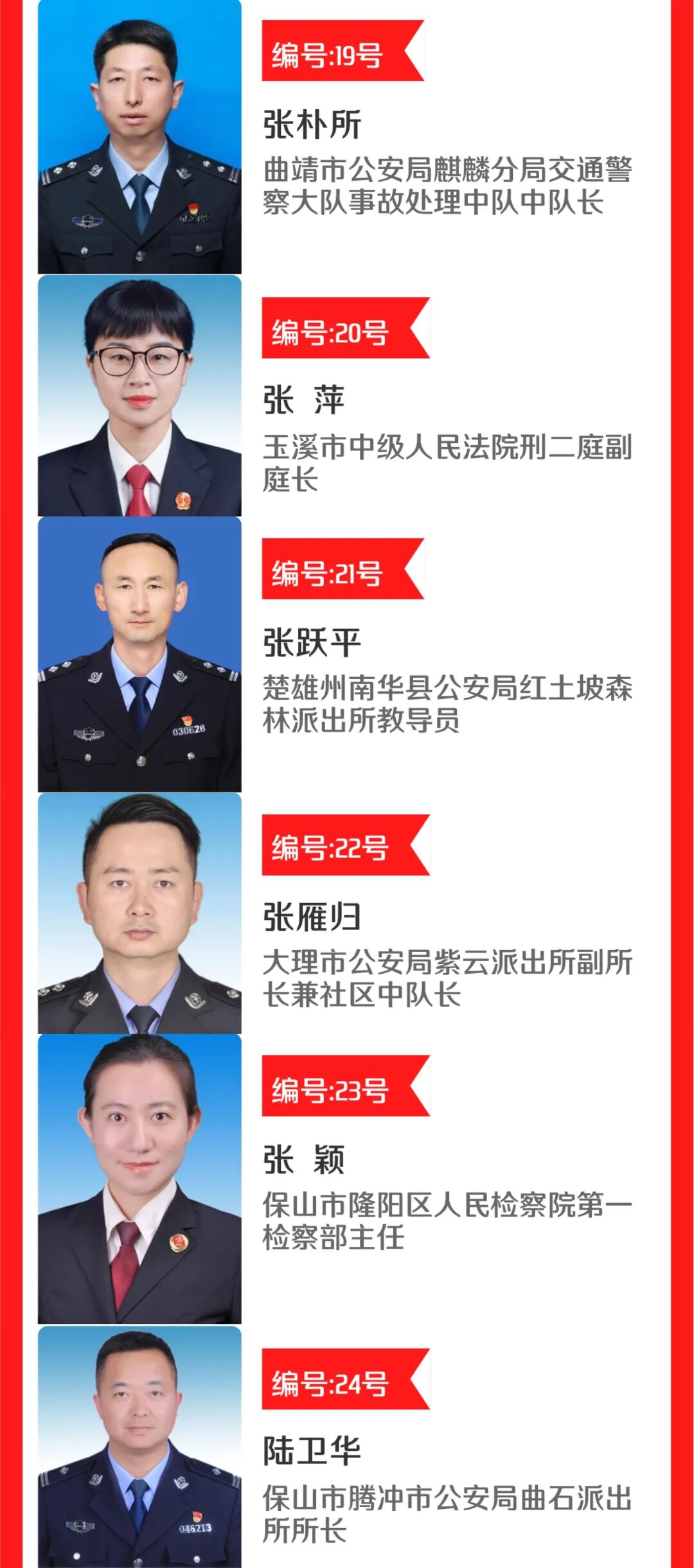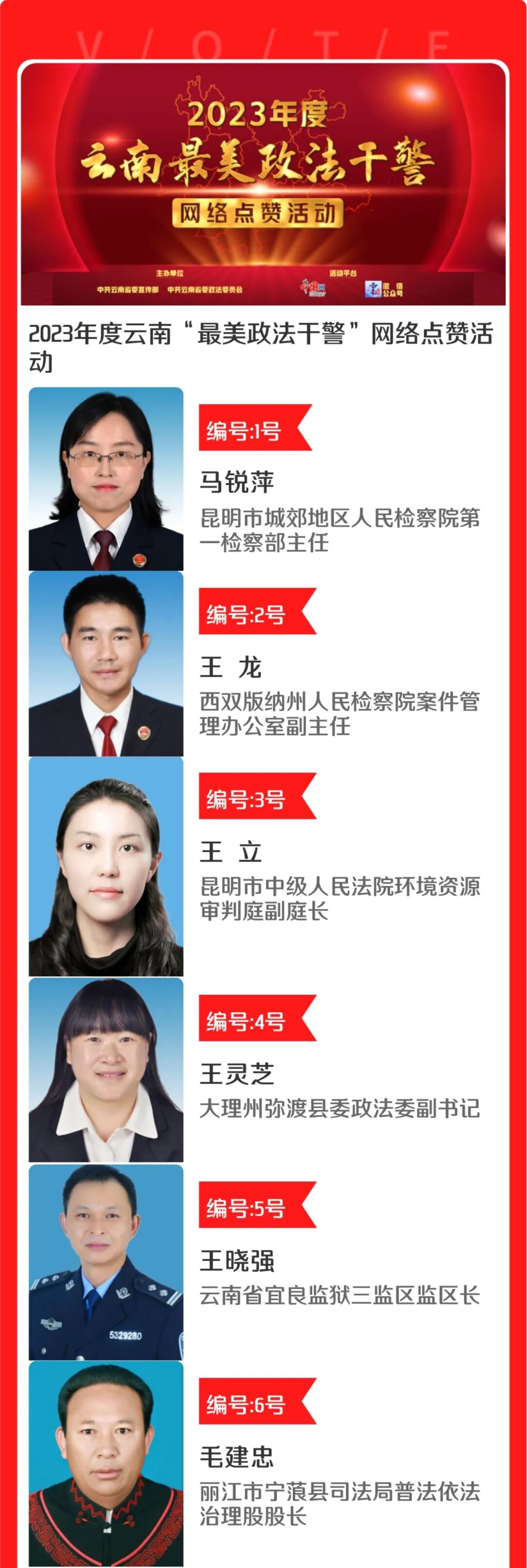 为弘扬政法队伍新风正气激励引导全省广大政法干警礼赞楷模、学习榜样、凝聚力量。中共云南省委宣传部、中共云南省委政法委员会联合中国网在全省组织开展“云南最美政法干警”网络点赞活动。省委宣传部、省委政法委将组织相关单位人员成立评审委员会,综合事迹材料、点赞情况、新媒体关注量等情况,评选出10名“最美政法干警”和10名“最美政法干警”提名奖获得者并举行发布仪式,并组织新闻媒体集中、持续报道他们的先进事迹,联动各类新媒体平台集中推送宣传。这些最美政法干警候选人用实际行动践行着对法治的信仰。他们不仅担负着维护社会治安的使命,更是社会正义的捍卫者和守护者。他们坚持原则、忠于职守,用公正和公平为群众解决实际问题,为构建和谐社会、维护公平正义作出了重要贡献。他们中,有的负重前行,守护岁月静好,有的扎根基层,践行法治为民的信念,有的日复一日,用法治的阳光照耀温暖每一个平凡的你我。在这片热土上,他们用汗水、鲜血甚至生命,谱写了一曲曲忠诚之歌、拼搏之歌、奉献之歌。用他们的坚守与担当,捍卫着法治,守护着我们的平安。