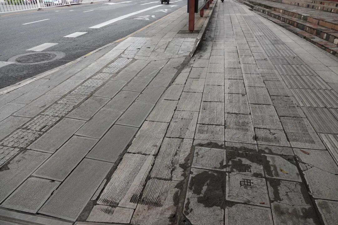 只能“空降”人行道地砖老化失去防滑功能