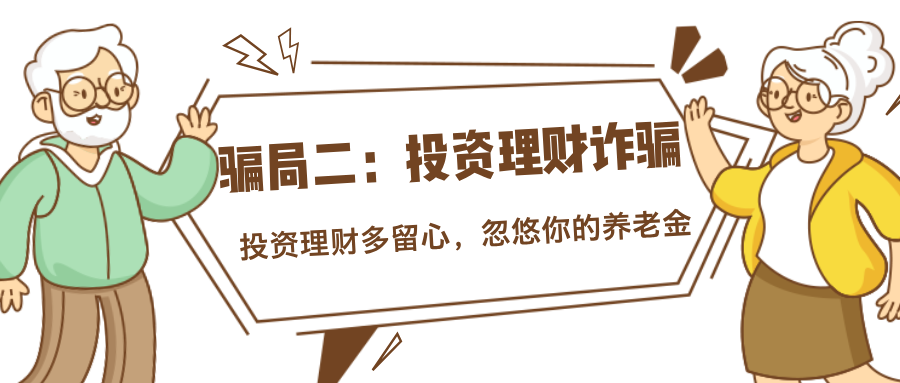 骗子打着“低投入、高回报”等幌子,诱骗老年人把房产、积蓄投资到他们所谓的理财产品上。前期,骗子会兑现“高回报”的承诺博取老年人的信任,从而使老年人加大投资力度。当投入资金达到一定数额时,骗子就会卷款跑路。