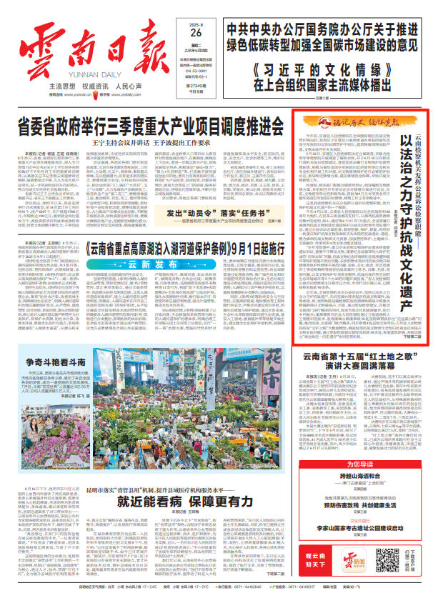 今年4月以来,云南省人民检察院以纪念抗战胜利80周年为契机,在民革云南省委的支持下,以滇西抗战资源相对集中的昆明、保山、德宏等6个州(市)为重点,全省部署开展滇西抗战文物和遗址遗迹保护公益诉讼检察专项监督行动,通过公益诉讼办案监督,督促挖掘、保护、修复、利用好一批重点保护抗战文物及面临灭失风险的抗战遗址、遗迹,整合滇西抗战文物和文化资源,加强管控保护、主题展示、文旅融合、传承利用4类主体功能区建设。