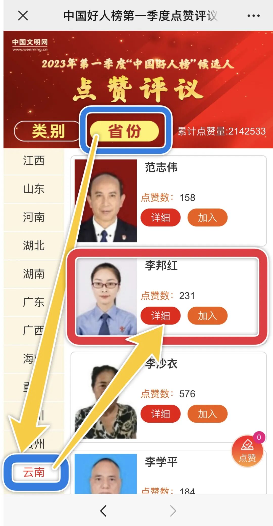 2.点击【省份】,选择【云南】,找到【李邦红】即可加入点赞。每位候选人当月只能点赞一次。