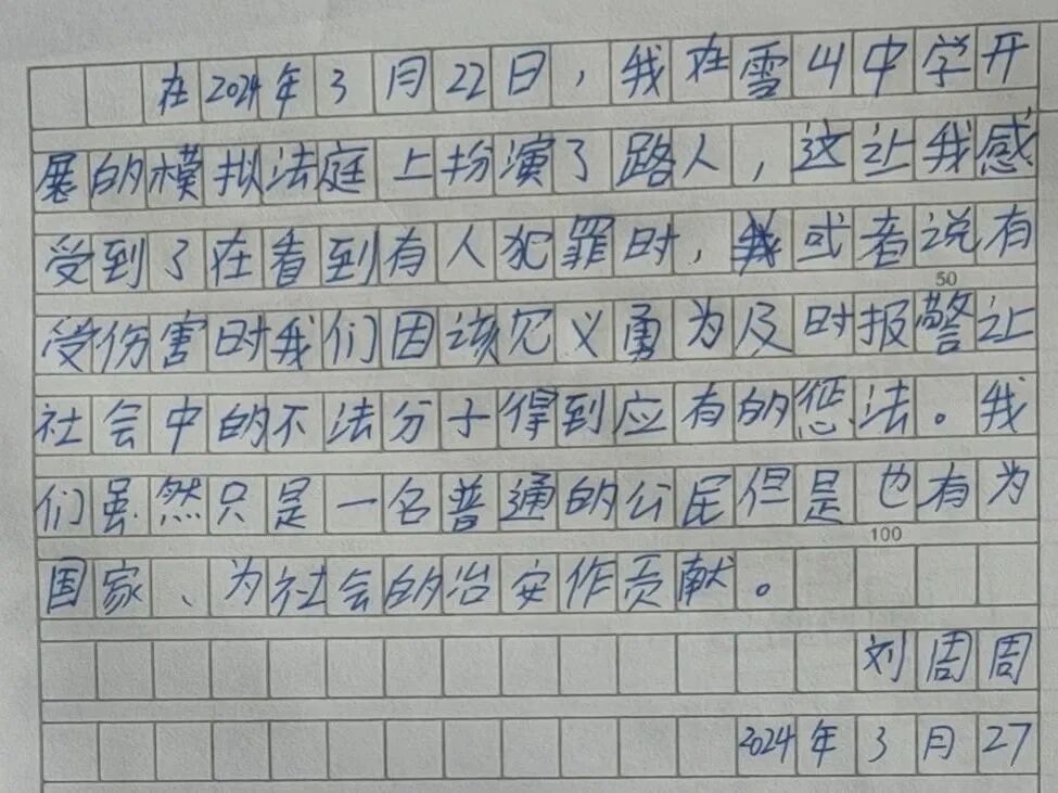 “通过模拟法庭,大家能够亲身感受到法律的严肃性,理解违法犯罪必将受到法律制裁的道理。活动中,同学们按照规范的庭审程序参与,营造出法庭庄严的氛围,这样的沉浸式体验让大家直观地认识到违法犯罪对社会、家庭以及自身带来的巨大危害和所要承担的严重后果,激发了他们知法、守法、尊法的积极性。”