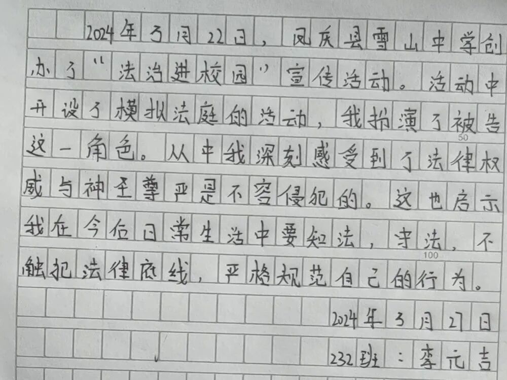 近日,凤庆县检察院联合雪山镇司法所、派出所、综治办在凤庆县雪山中学以“情景剧+模拟法庭+现场普法问答”的方式开展一次“沉浸式”普法。11名学生穿上制式服装,完成了审判人员、公诉人、书记员、法警、辩护人、被告人的角色扮演,并按照法庭调查、举证质证、法庭辩论、法庭教育、最后陈述、当庭宣判完成了刑事审判的整个流程。