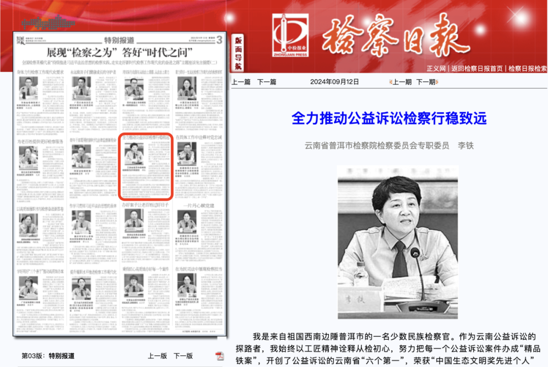 我是来自祖国西南边陲普洱市的一名少数民族检察官。作为云南公益诉讼的探路者,我始终以工匠精神诠释从检初心,努力把每一个公益诉讼案件办成“精品铁案”,开创了公益诉讼的云南省“六个第一”,荣获“中国生态文明奖先进个人”称号。