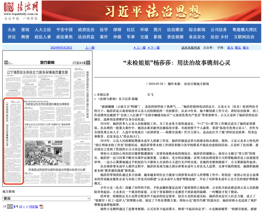 “谢谢嬢嬢(云南方言“阿姨”),是你的陪伴给了我勇气……”杨莎莎接到电话的这天,正是小玉(化名)收到判决书的日子。杨莎莎是云南省临沧市云县人民检察院的一名检察官,从业14年来,她不断创新工作方式、讲好法治故事,因工作成绩突出被授予“全国三八红旗手”“全国巾帼建功标兵”“云南省优秀共产党员”等荣誉称号。小玉正是听了杨莎莎的法治课后,选择用法律维护自身合法权益。