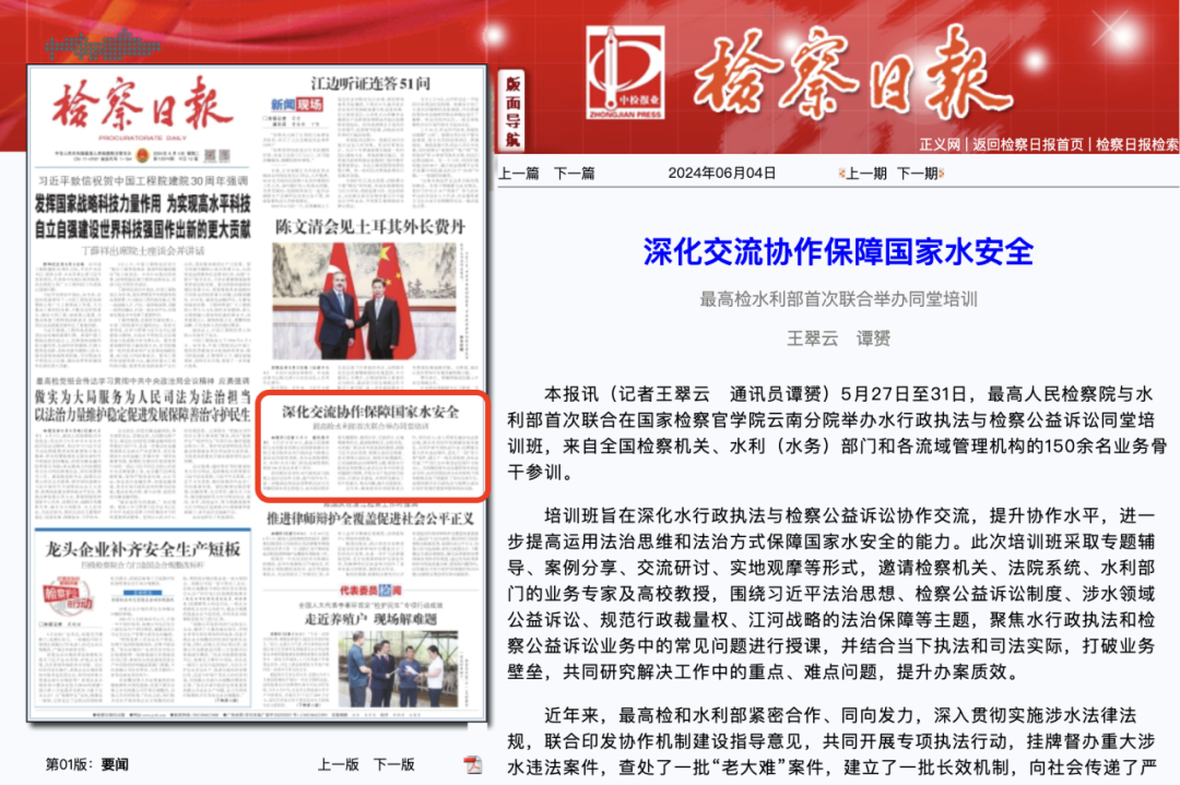 5月27日至31日,最高人民检察院与水利部首次联合在国家检察官学院云南分院举办水行政执法与检察公益诉讼同堂培训班,来自全国检察机关、水利(水务)部门和各流域管理机构的150余名业务骨干参训。