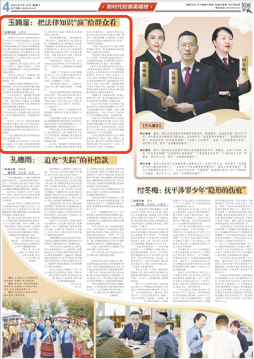 ●玉喃溜 傣族,现任云南省景洪市检察院党组成员、副检察长。在基层办案一线工作13年,共办理各类刑事案件1900余件。先后被评为“全国优秀女检察官”、“全国最美公务员”、中央政法委“双百政法英模”、“全国三八红旗手”、全国“人民满意的公务员”。2023年12月,获评“全国模范检察官”。