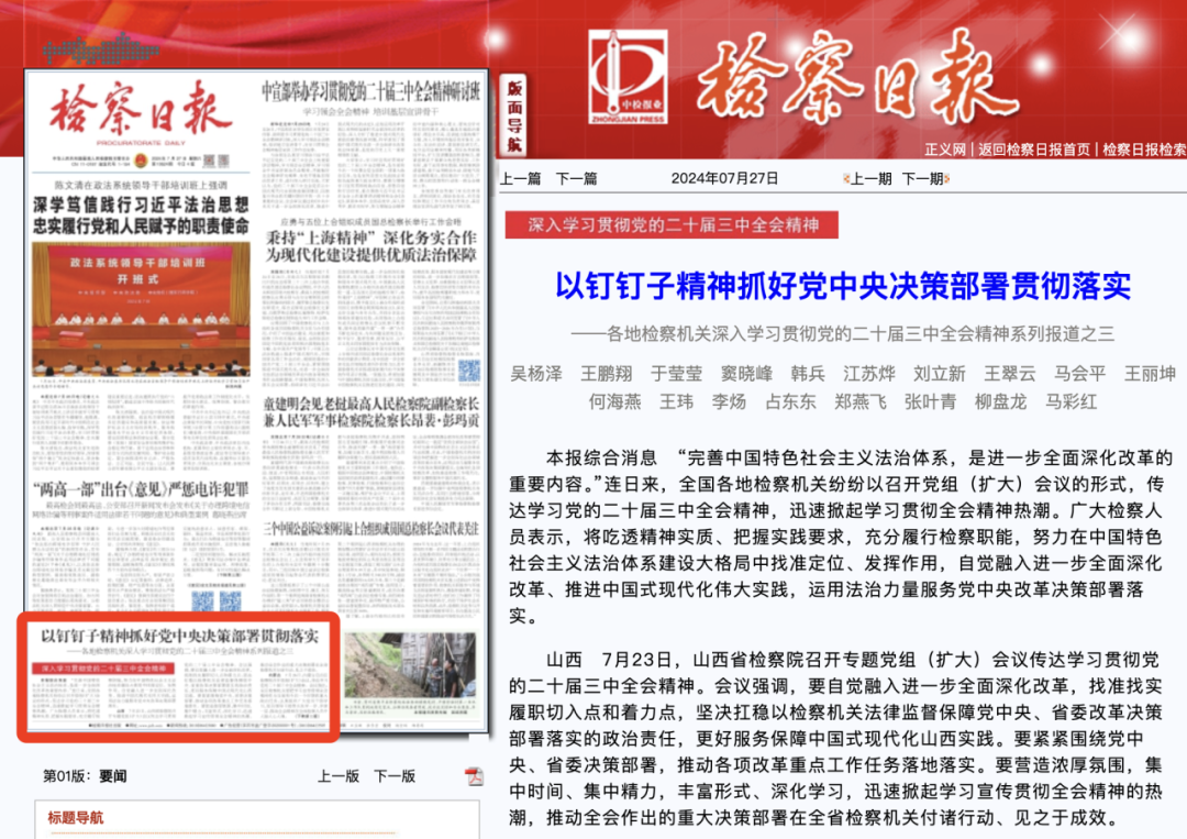 山西 7月23日,山西省检察院召开专题党组(扩大)会议传达学习贯彻党的二十届三中全会精神。会议强调,要自觉融入进一步全面深化改革,找准找实履职切入点和着力点,坚决扛稳以检察机关法律监督保障党中央、省委改革决策部署落实的政治责任,更好服务保障中国式现代化山西实践。要紧紧围绕党中央、省委决策部署,推动各项改革重点工作任务落地落实。要营造浓厚氛围,集中时间、集中精力,丰富形式、深化学习,迅速掀起学习宣传贯彻全会精神的热潮,推动全会作出的重大决策部署在全省检察机关付诸行动、见之于成效。