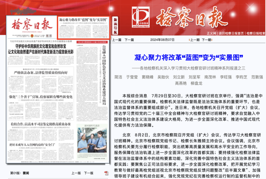 7月29日至30日,大检察官研讨班在京举行,强调“法治是中国式现代化的重要保障。检察机关法律监督既是法治实施体系的重要环节,也是法治监督体系的重要组成部分”。连日来,各地检察机关召开党组(扩大)会议,传达学习贯彻党的二十届三中全会精神与大检察官研讨班精神,要求自觉融入中国特色社会主义法治体系建设大格局,为进一步全面深化改革、推进中国式现代化提供有力法治保障。