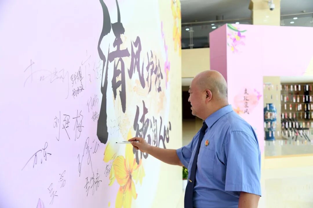 活动现场,检察人员和家属在16个“廉”字组成的廉洁小课堂前打卡,参加廉政知识答题,共同体验非遗漆扇手工制作,清风吹动了墙上的廉洁知识卡片,大家脸上都洋溢着灿烂的笑容。