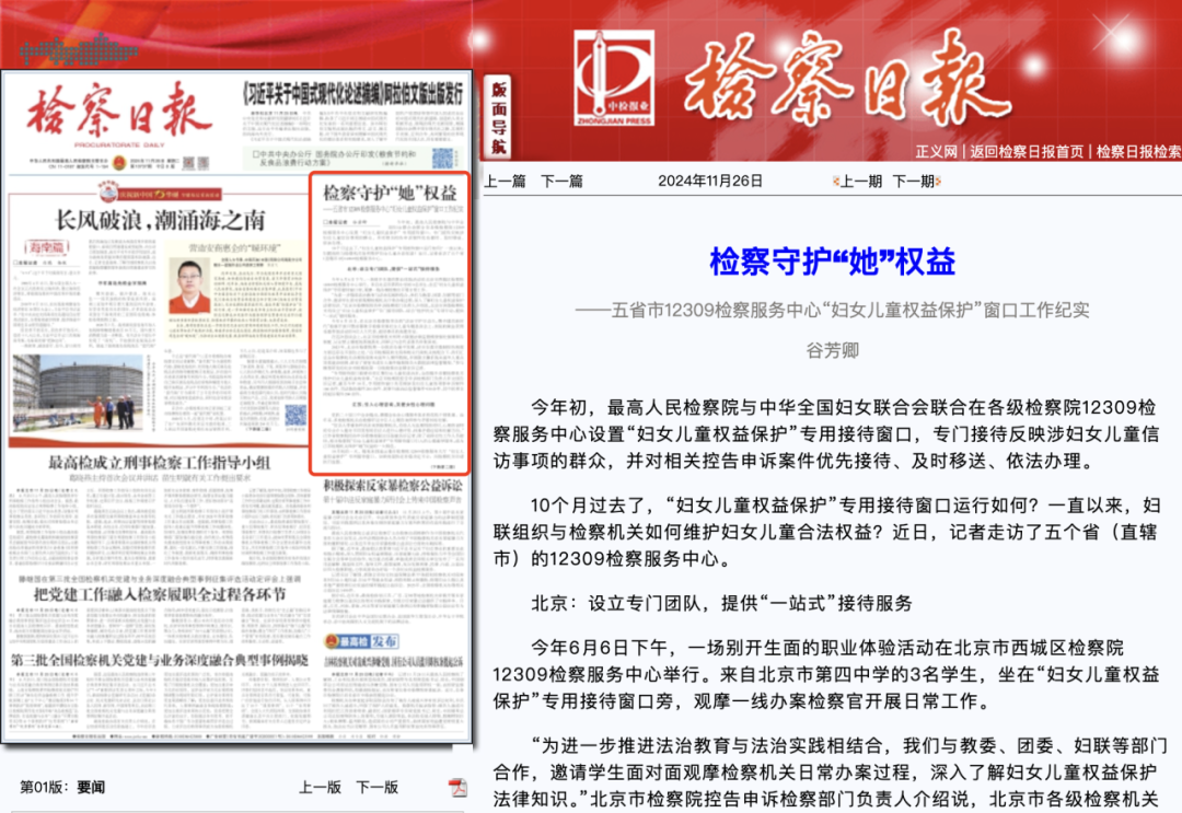 今年初,最高人民检察院与中华全国妇女联合会联合在各级检察院12309检察服务中心设置“妇女儿童权益保护”专用接待窗口,专门接待反映涉妇女儿童信访事项的群众,并对相关控告申诉案件优先接待、及时移送、依法办理。