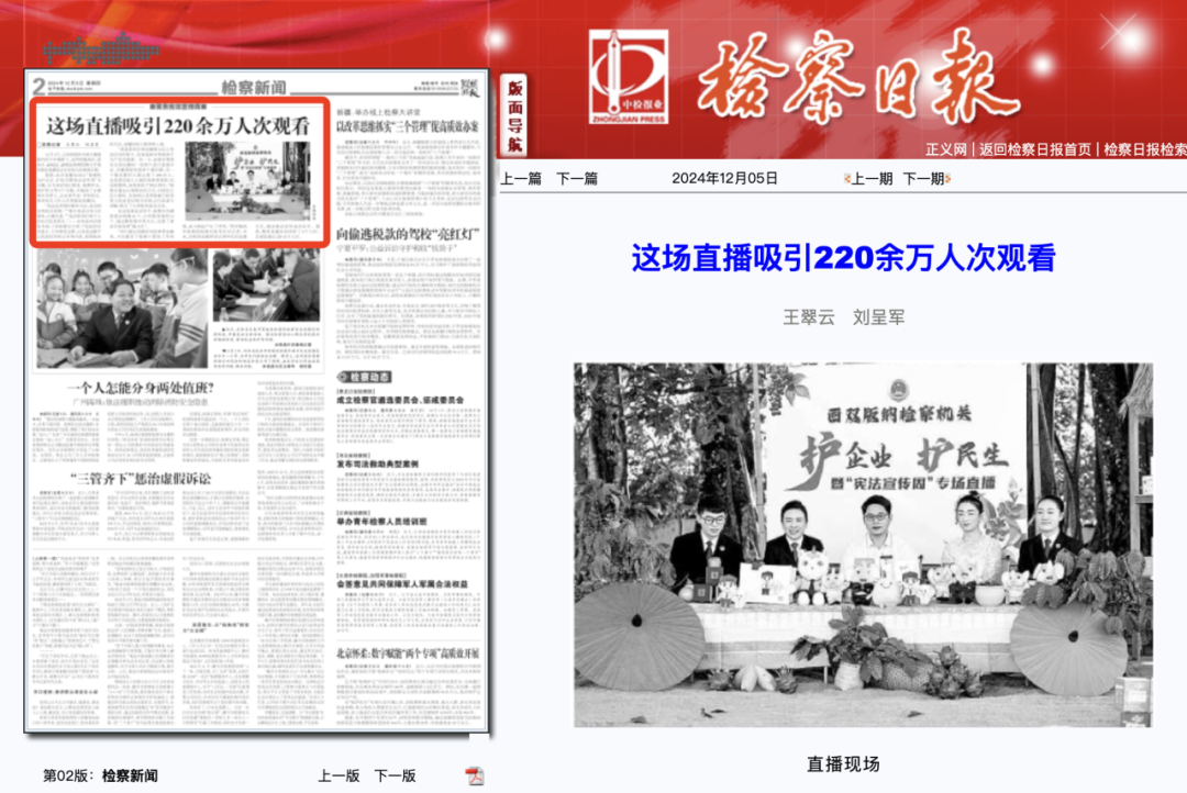 “我们通过直播活动延伸普法触角,不仅激发了检察干警的工作热情,也与粉丝产生了共鸣。”西双版纳州检察院检察长陈旻告诉记者,未来,该院将会继续尝试多样化的直播方式,推动普法宣传走深走实。据悉,整场直播活动持续了4个小时,总浏览量达220余万人次。