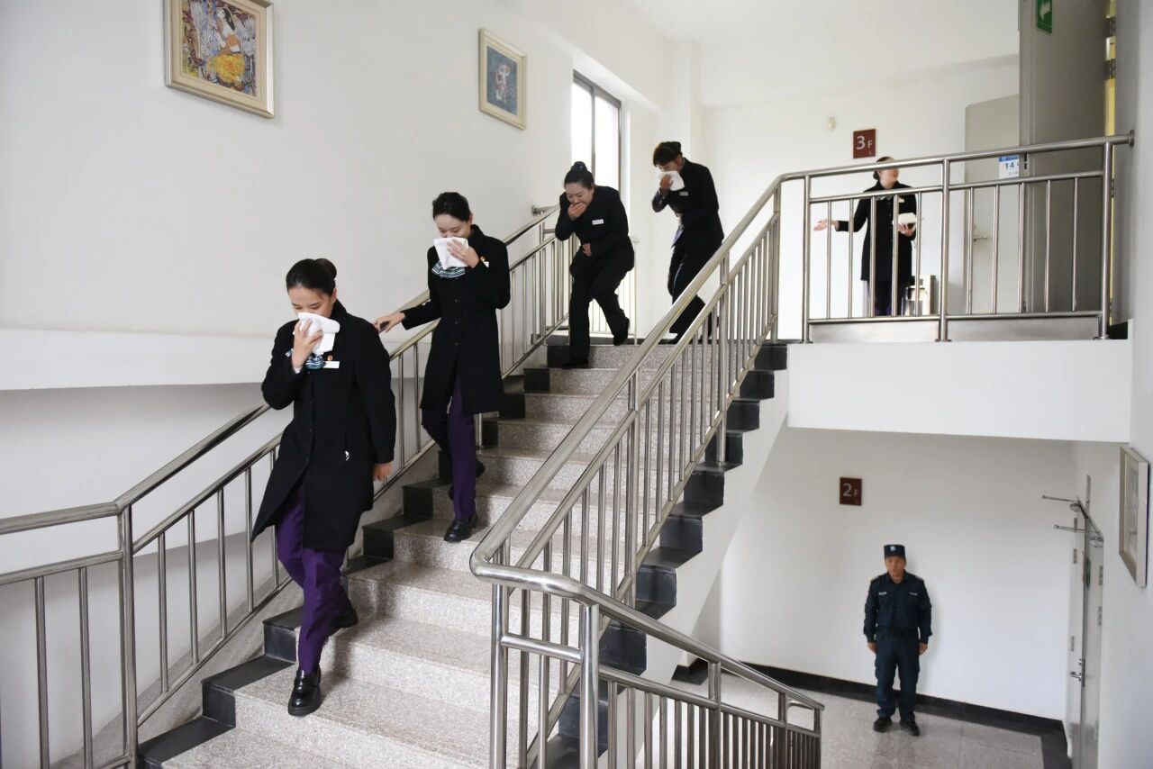 随着急促的消防警报声响起,逃生疏散演练正式启动。模拟办公区域突发火情后,疏散引导员迅速到位,按照预设逃生路线,引导参训人员用湿毛巾捂住口鼻,弯腰低姿、快速有序地沿安全通道撤离。整个过程中,大家听从指挥、配合默契,迅速疏散至指定安全集结区域,随后工作人员逐一清点人数,确保无一人遗漏。此次演练有效检验了应急预案的实用性和各部门协同作战能力,提升了参训人员的应急反应速度和逃生自救技能。